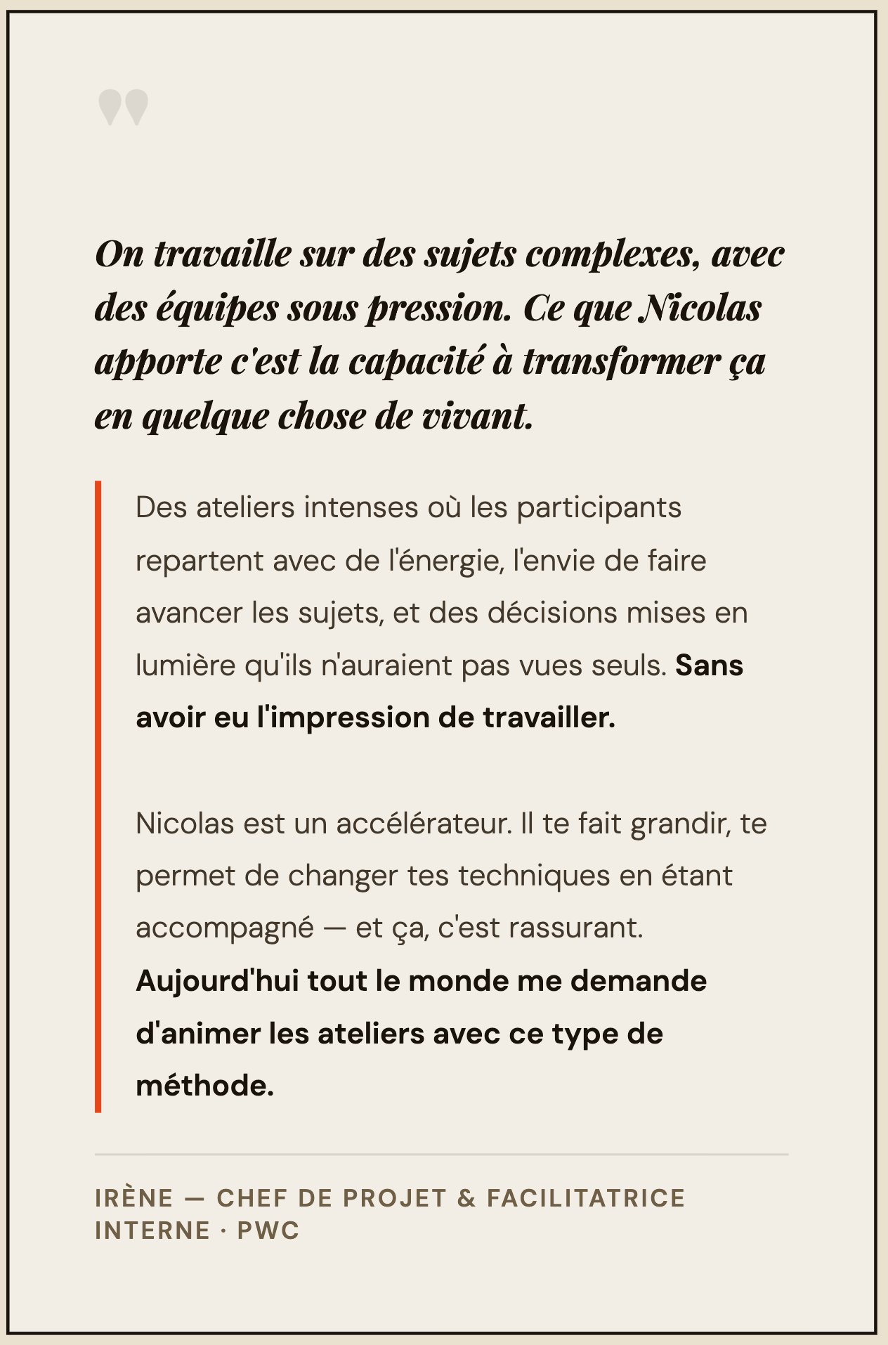 Tu animes des ateliers — mais tu sens qu'il te manque la méthode, les outils ou la posture pour les faire monter d'un cran. Un accompagnement individuel sur mesure pour level up tes ateliers — sur ton projet réel, à ton rythme, dans ton contexte.