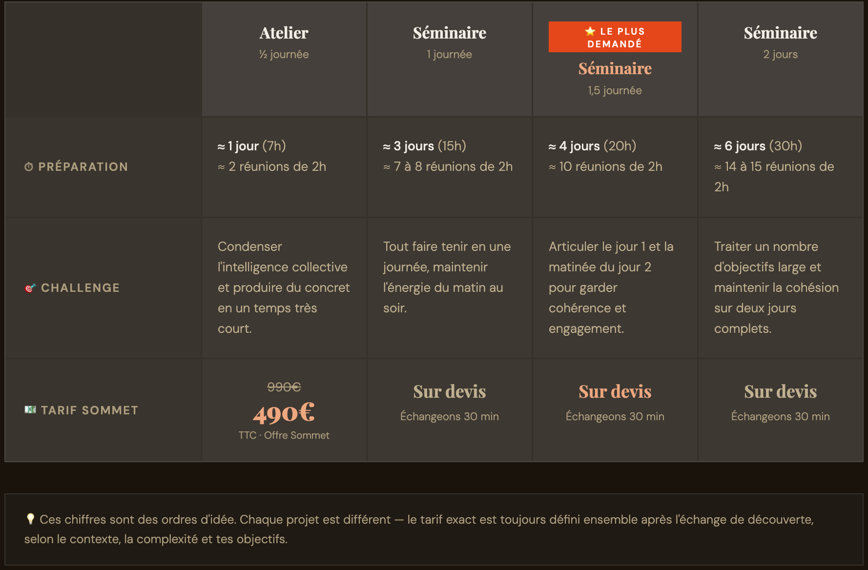 2×2h c'est le point d'entrée — suffisant pour décoincer un atelier ou préparer une session simple. Un séminaire d'une journée complète ou un dispositif complexe demande naturellement plus de préparation. La grille tarifaire ci-dessus te donne un ordre d'idée selon la durée de ton événement.