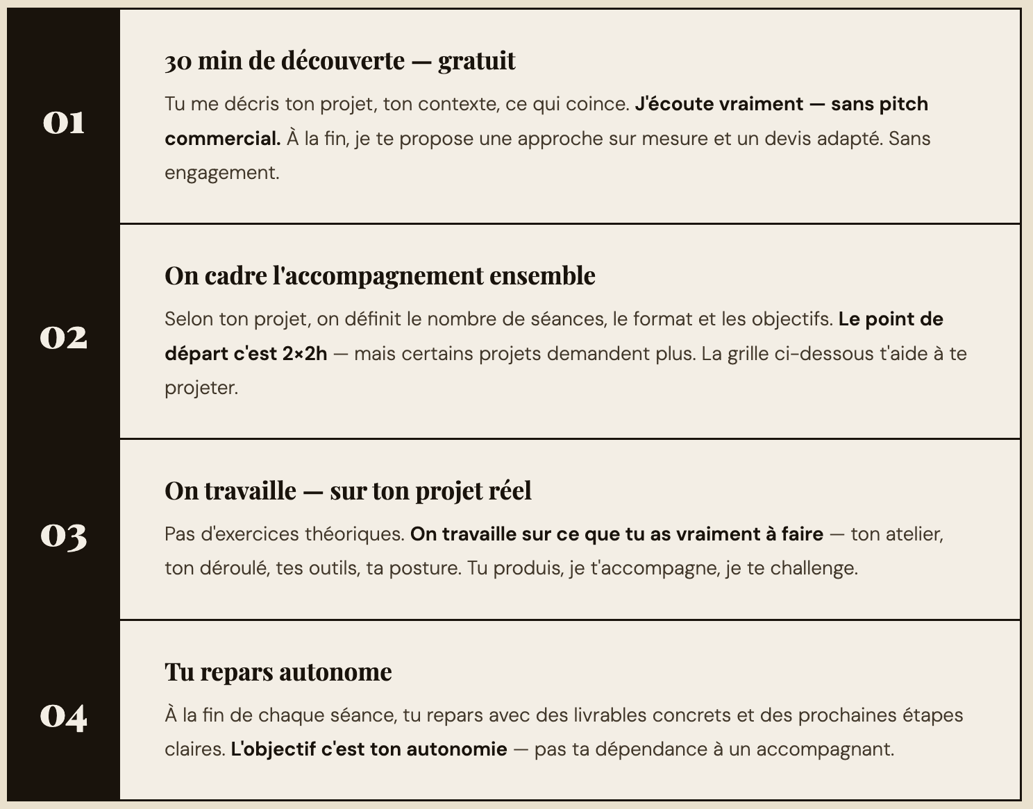 Parce que le mentoring est une prestation sur mesure — il n'y a pas de package standard. Je veux comprendre ton projet avant de te proposer quoi que ce soit. Ces 30 minutes permettent de voir si on est alignés et de définir ensemble ce qui fait le plus de sens pour toi.